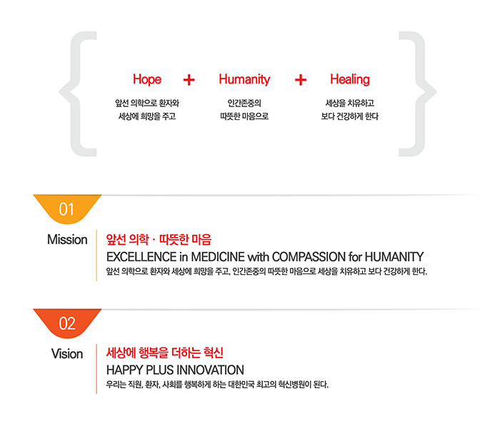 HOPE 앞선 의학으로 환자와 세상에 희망을 주고 + Humanity 인간존중의 따뜻한 마음으로 + Healing 세상을 치유하고 보다 건강하게 한다