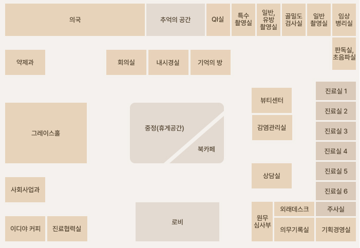 원무부(접수·수납), 영상의학과(골밀도검사, 일반X-ray), 신경심리실, 임상병리실, 진료실, 약제과, 그레이스홀, 진료협력실, 카페, 사회사업과, 간호부, 북-카페, 뷰티룸, 상담실1-2