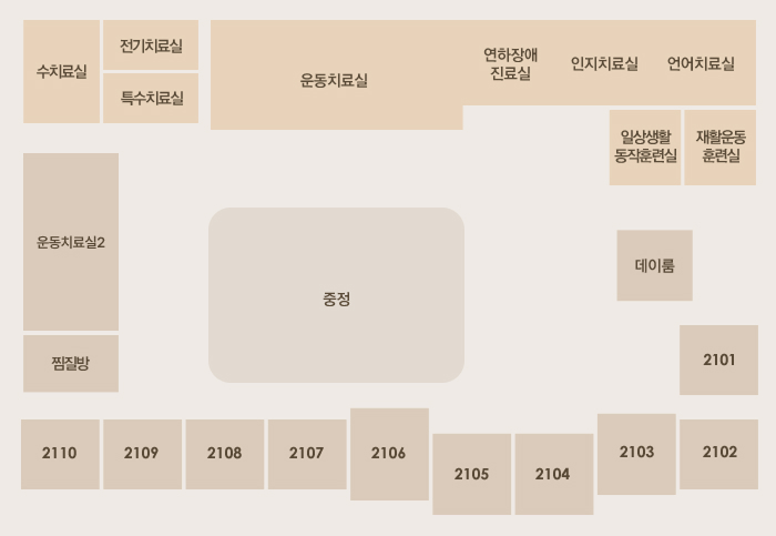 21병동(2101-2110), 재활치료실(물리치료, 작업치료, 언어치료, 보행치료, 수치료), 한의학진료실, 찜질방, 데이룸, 환자식당